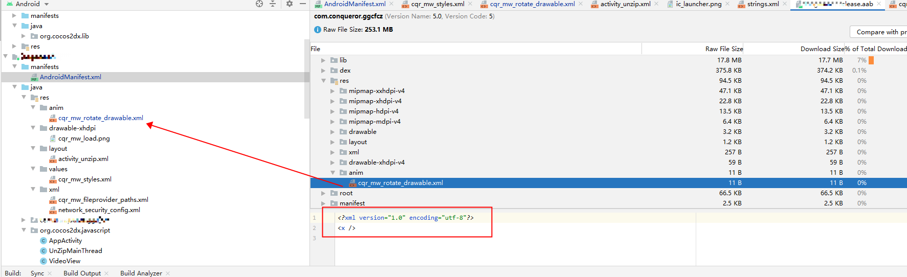 这个是构建.aab包之后,查看包体中的.xml配置发现里面内容丢失。