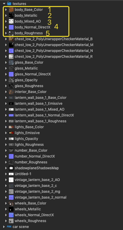 我查看了文档,里面关于模型导入的篇章很短,也没有详细讲模型导入后如何设置材质和纹理映射的内容,我在网上搜索了一些视频教程,里面导入的模型都比较简单只有一张纹理,直接设置AlbedoMap就好了,我下载的这个模型,每个部件的纹理有5张,不知道如何一一对应:
