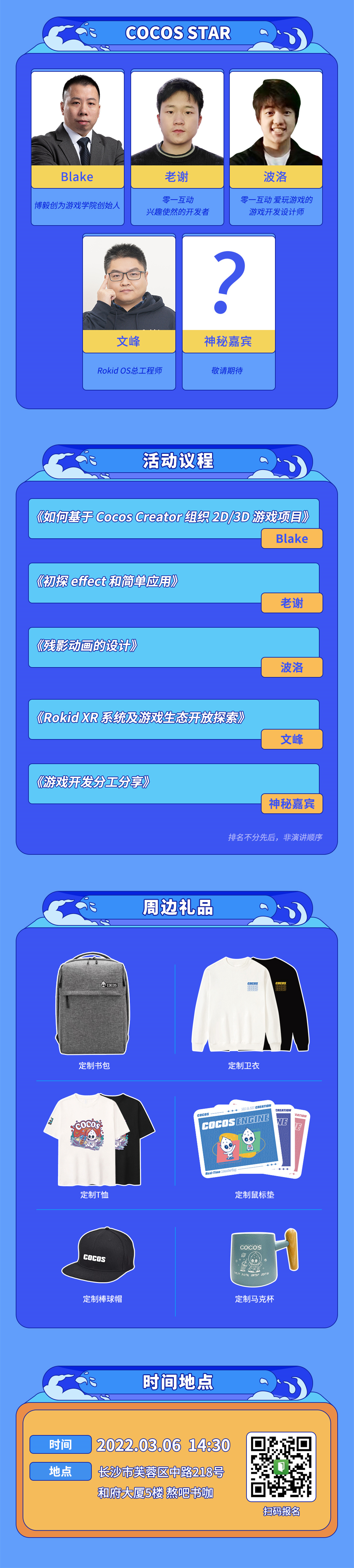 本次长沙站,「博毅创为」游戏学院创始人 Blake,零一互动的老谢、波洛,Rokid OS 总工程师文峰,以及一位 「不愿意透露姓名」的神秘嘉宾 将带来引擎应用与游戏开发技术分享。主题与流程↓↓↓
