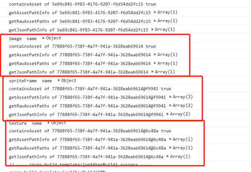 错误描述:自动图集本身的uuid、image的uuid、texture的uuid都不能查询到结果;而被引用到的spriteFrame可以查询到containsAsset为true,但随后生成的路径都是错误的,应该是一个临时路径,在打包后是不存在的。