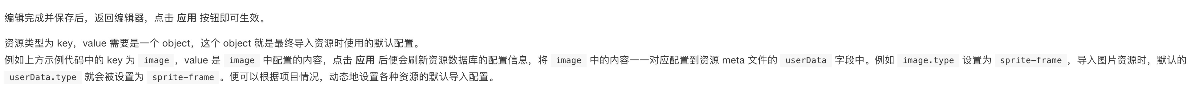 例如上方示例代码中的 key 为 image ,value 是 image 中配置的内容,点击 应用 后便会刷新资源数据库的配置信息,将 image 中的内容一一对应配置到资源 meta 文件的 userData 字段中。例如 image.type 设置为 sprite-frame ,导入图片资源时,默认的 userData.type 就会被设置为 sprite-frame 。便可以根据项目情况,动态地设置各种资源的默认导入配置。