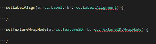 所有的内嵌枚举类型都无法当成类型来使用,在vscode里都会报错 因为这里Label和Texture2D都没有生成namespace,只生成了class,导致内嵌枚举被认为是一个值,并不是一个枚举