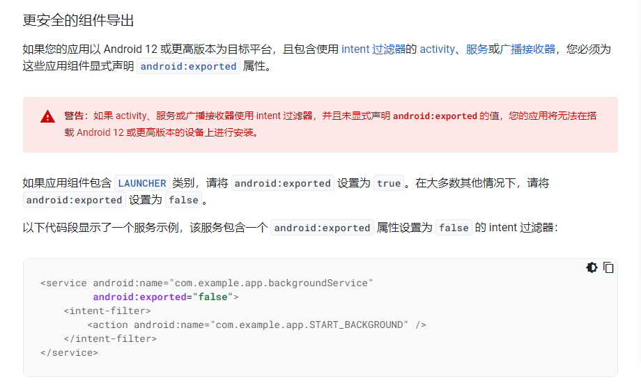 1 您上传的APK或Android App Bundle内含活动、活动别名、服务或广播接收器,这些项目有intent过滤器,但没有"androidexported"届性设置。此文件无法在Android 12或更高版本上安装。详情请参阅:developer.android.com/about/versions/12/behavior-changes-12#exported