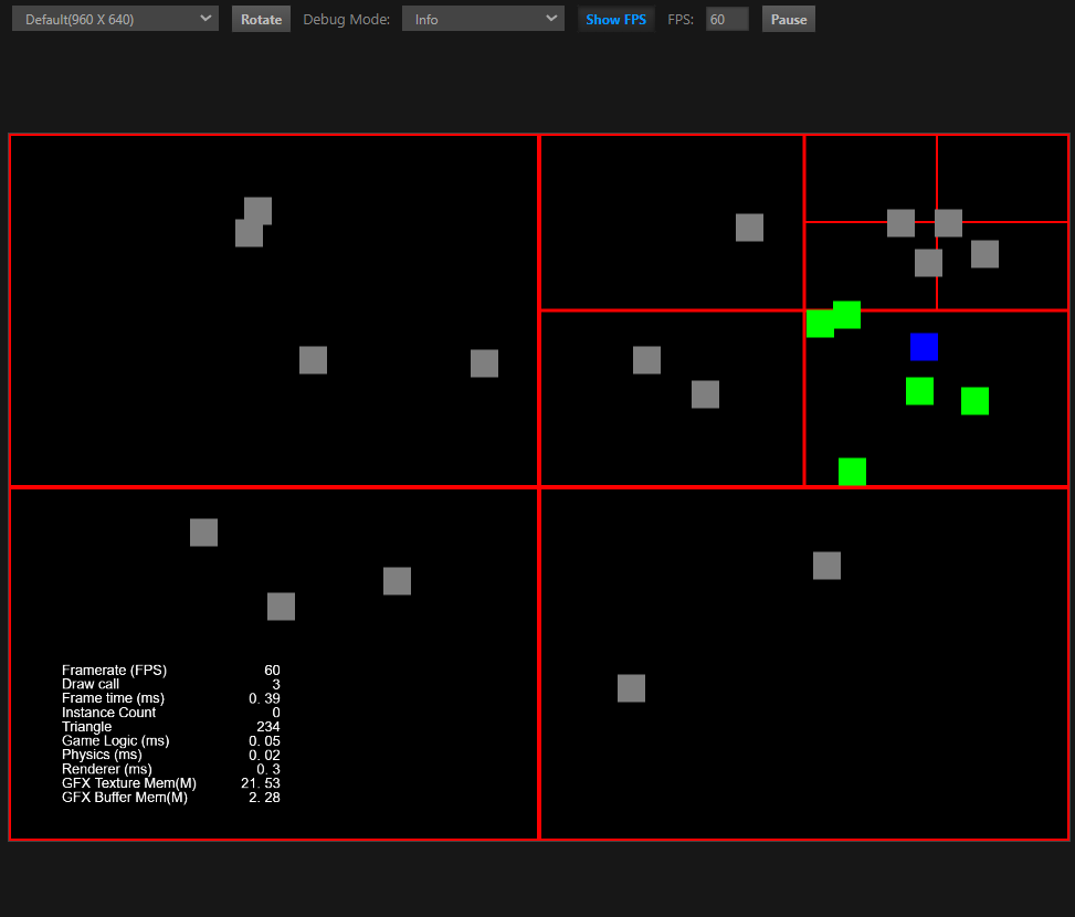 打开项目运行main场景,鼠标左键点击添加四叉树对象,鼠标右键添加检索对象,绿色的表示筛选出来需要与检索对象进行碰撞检测的四叉树对象