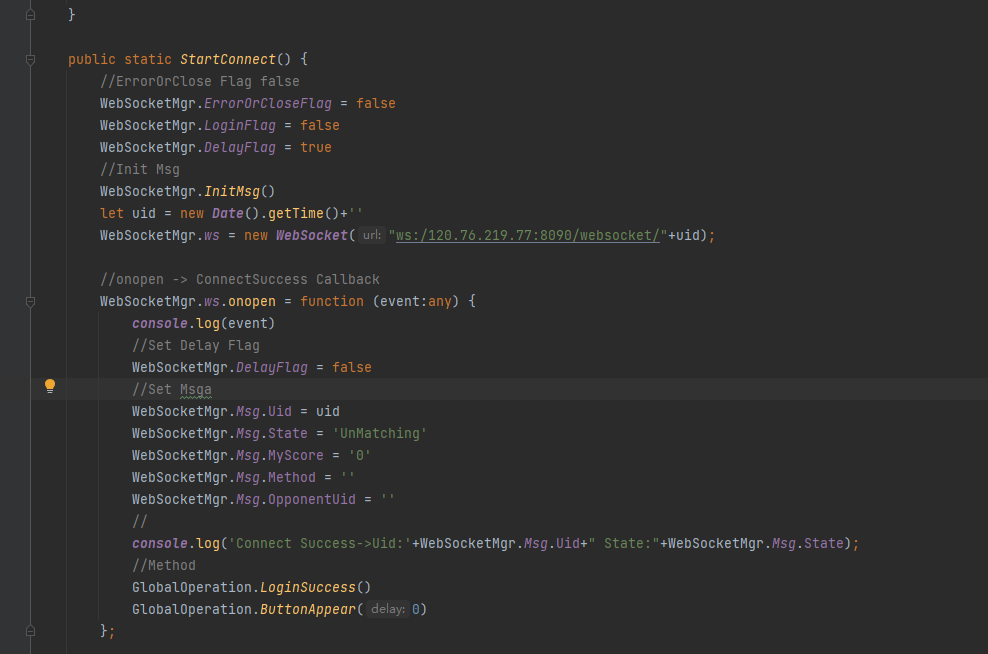 WebSocketMgr.ws = new WebSocket(“ws://120.76.219.77:8090/websocket/”+uid);