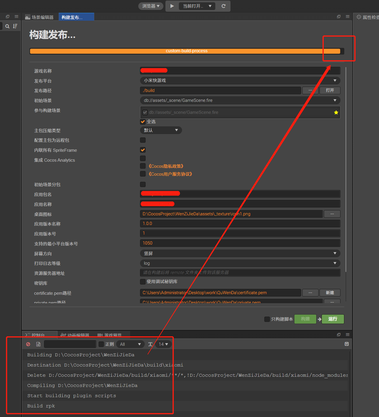 异常问题:点击构建小米快游戏 进度条会一直走 直到log显示 build rpk 这一步 进度条会在此卡住、