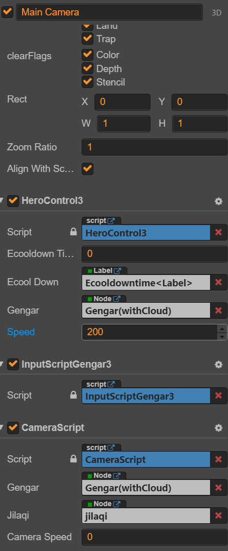 动画是Jilaqi这个节点上面带的,Jilaqi这个节点上面动画组件和clip文件挂载好了,camera节点上也拉了脚本,节点也挂载好了,但控制台报错