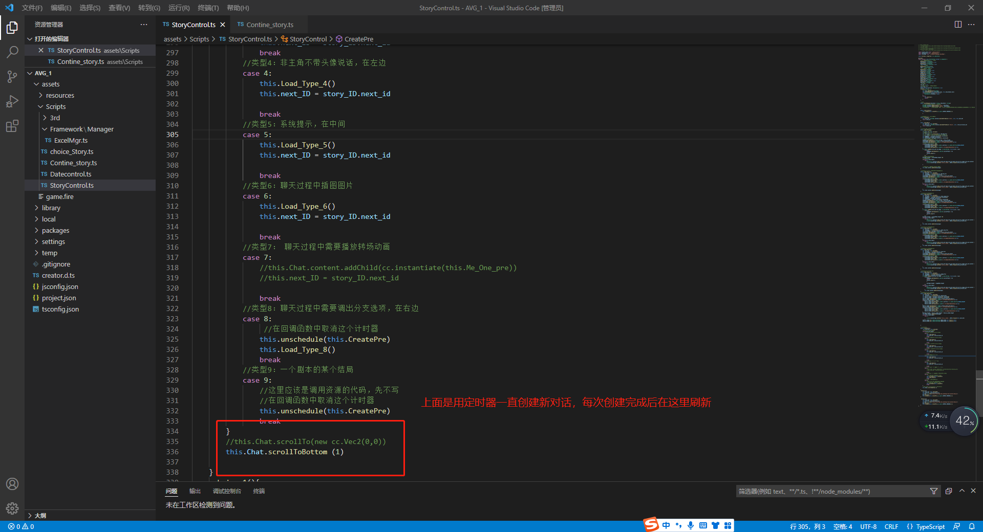 给自动创建对话添加一个停止和继续的函数,玩家滑动时,调用停止,手动滑倒底部时调用继续