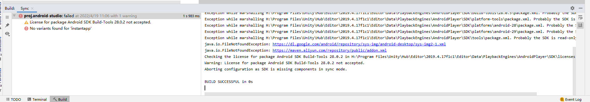 谢谢上面两位的回复。确实是sdk的问题,在cocos的设置里修改了sdk的路径就好了,一直在纠结 28.0.2 的问题。另外上面的大哥说的去掉 instantapp 在settings.gradle 里