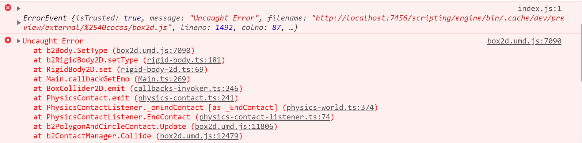 我想实现两个2D刚体发生碰撞就消失,在碰撞回调里把它们从父节点移除,结果出错了,不知道是什么原因……