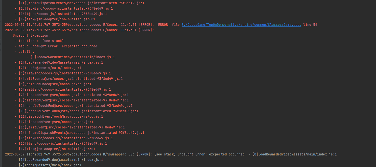 2022-05-09 11:39:06.436 3572-3596/com.topon.cocos E/JavaScriptJavaBridge: [ERROR] (D:/ProgramFiles/CocosDashboard/resources/.editors/Creator/3.4.2/resources/resources/3d/engine-native/cocos/bindings/manual/JavaScriptJavaBridge.cpp, 610): call valid: 0, call.getArgumentsCount()= 1
