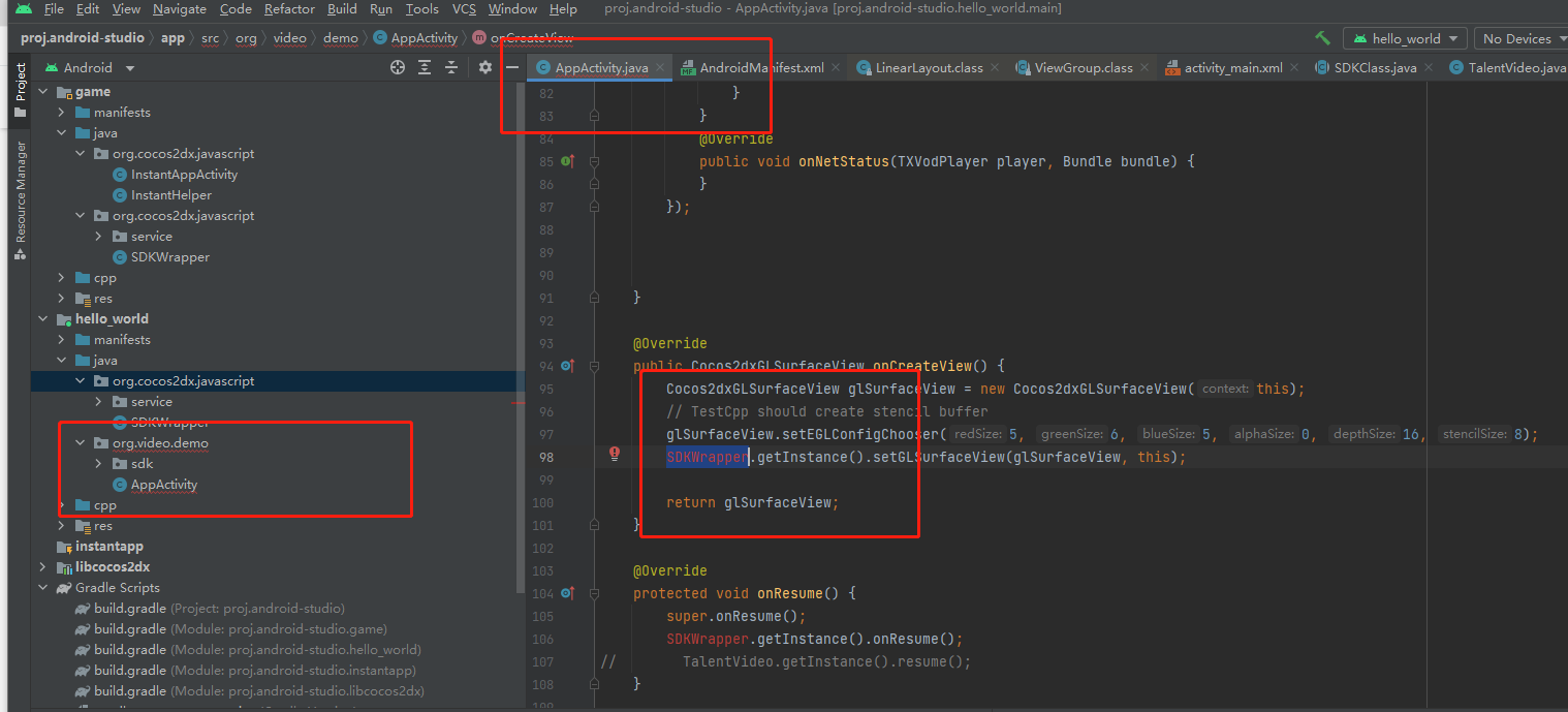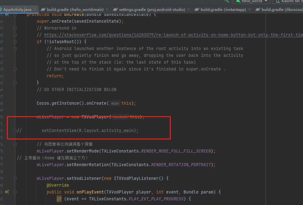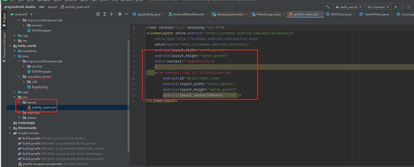 还有cocos打包出来的项目是不是不能在onreate里写setContetView()这个方法?还是因为我没找到R.layout.activity_main所以才报错的?如果不能用xml的话,怎么才能把视频展现出来呢?腾讯的sdk需要传一个view进去。