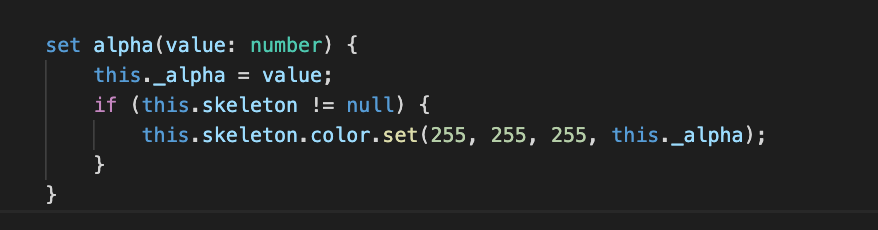 为了实现角色死亡,闪烁后消失的效果,对spine动画设置透明度变化代码如图: