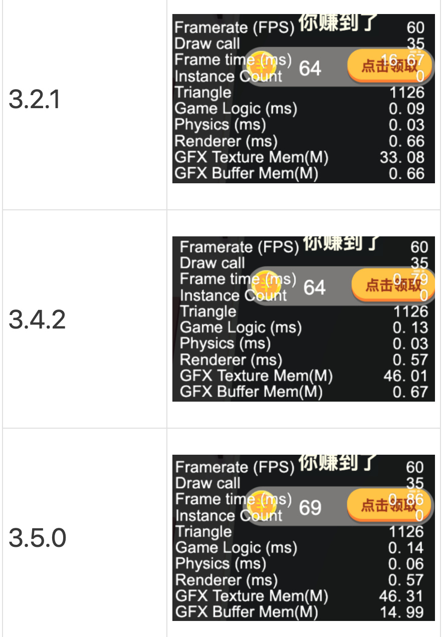 为了排除我们项目个体因素,我用 Cocos Dashboard 创建了 3.2.1 的“快上车”项目,完成两个订单,记录profiler 参数,然后对项目依次升级到3.4.2和3.5.0再次测试。数据 如下: