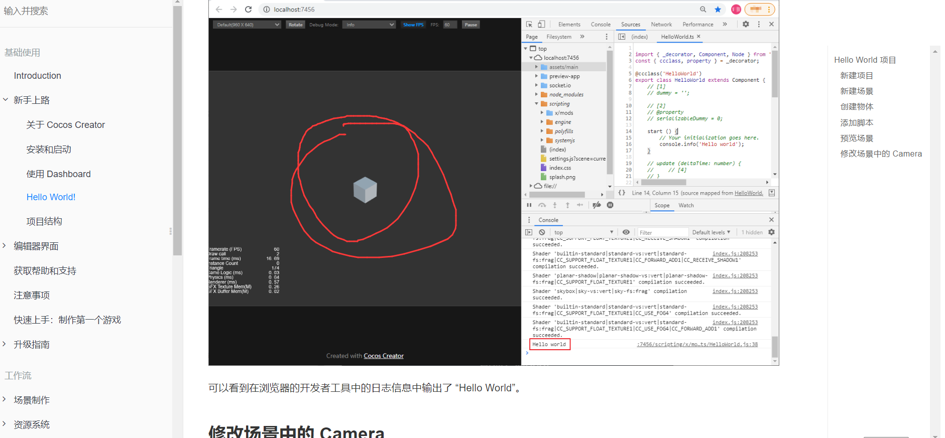 这是cocos creator上的手册文档——新手上路——hello world 中的截图