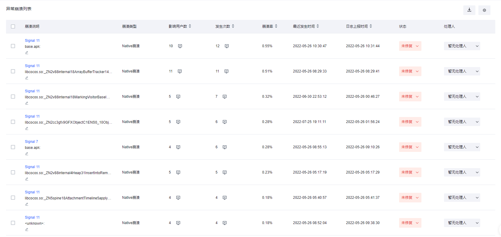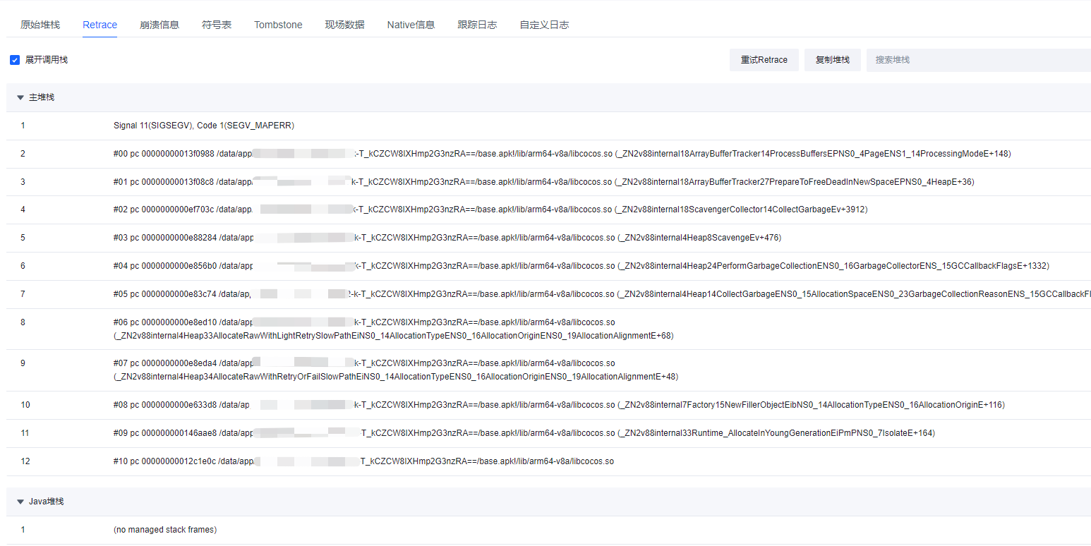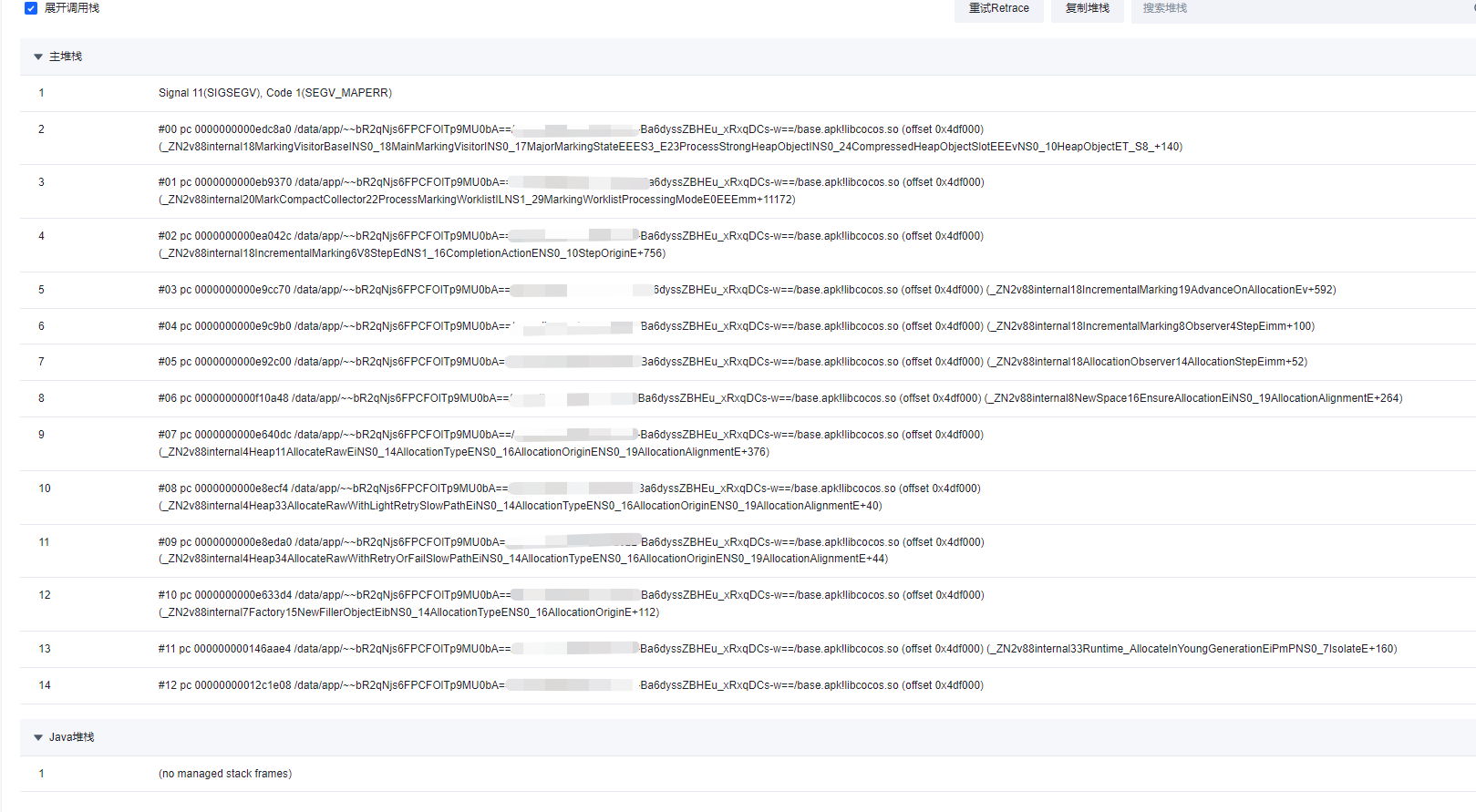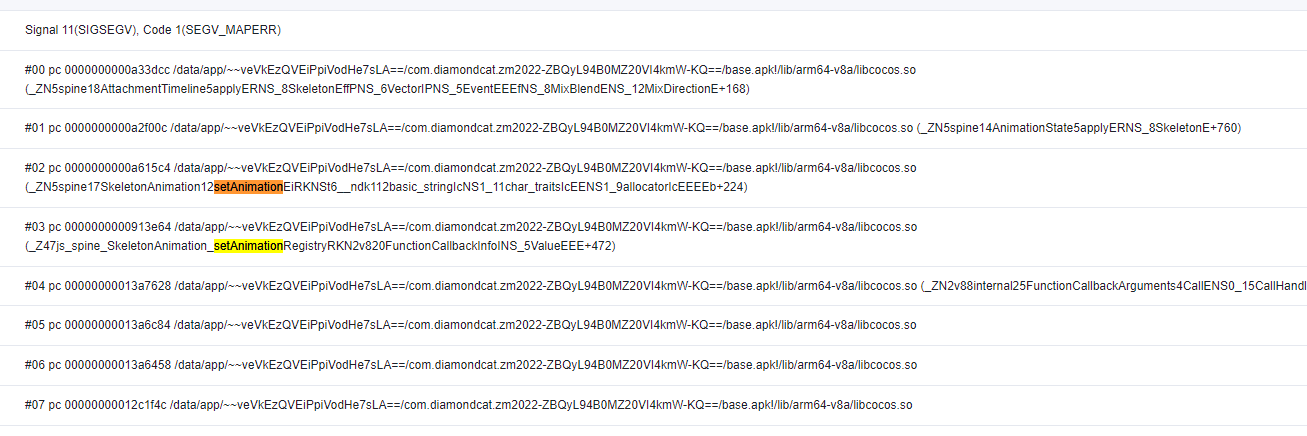 求助帖!!!android上线测试,sdk抓到大量不同类的native崩溃,各种机型各种android版本都有。能力有限retrace信息无法确定原因,都指向libcocos.so,网上查了好久基本查不到有用的信息,官方能帮忙看看可能原因吗?