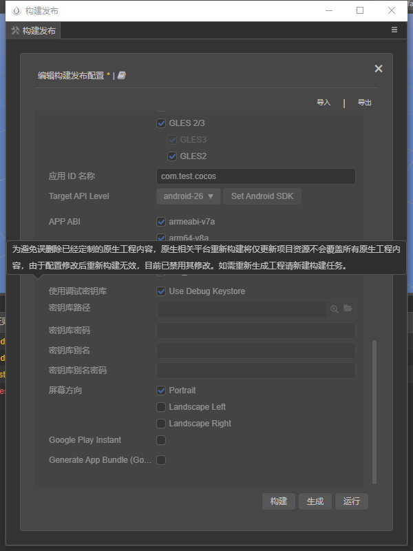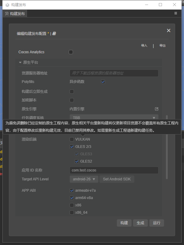 {“name”:“BuildTest”,“platform”:“android”,“buildPath”:“project://build”,“debug”:false,“md5Cache”:false,“sourceMaps”:false,“replaceSplashScreen”:false,“mainBundleCompressionType”:“merge_dep”,“mainBundleIsRemote”:false,“mergeStartScene”:false,“experimentalEraseModules”:false,“compressTexture”:true,“packAutoAtlas”:true,“startScene”:“0d6e0ba9-d904-4d5a-8492-f242fa2a0b3a”,“scenes”:[{“url”:“db://assets/scene.scene”,“uuid”:“0d6e0ba9-d904-4d5a-8492-f242fa2a0b3a”,“inBundle”:false}],“outputName”:“android”,“packages”:{“android”:{“packageName”:“com.test.cocos”,“orientation”:{“portrait”:true,“upsideDown”:false,“landscapeRight”:false,“landscapeLeft”:false},“apiLevel”:“android-26”,“appABIs”:[“arm64-v8a”,“armeabi-v7a”],“useDebugKeystore”:true,“keystorePath”:"",“keystorePassword”:"",“keystoreAlias”:"",“keystoreAliasPassword”:"",“appBundle”:false,“androidInstant”:false,“remoteUrl”:"",“sdkPath”:"",“ndkPath”:"",“renderBackEnd”:{“vulkan”:false,“gles3”:true,“gles2”:true}},“native”:{“polyfills”:{“asyncFunctions”:true},“encrypted”:false,“xxteaKey”:“49HaBy3LNIQaUoVh”,“compressZip”:false,“makeAfterBuild”:false,“JobSystem”:“tbb”},“cocos-service”:{“configID”:“700152”,“services”:[]}}}