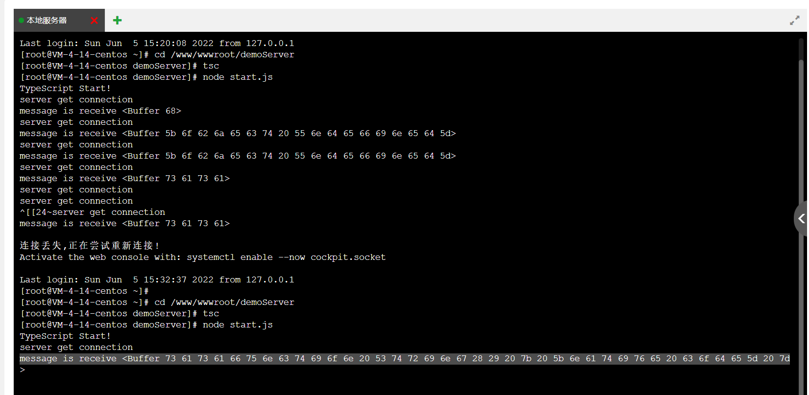 想给游戏加个排行榜功能,尝试用客户端给服务器发消息,现在已经把客户端和服务端连接上了,客户端console可以收到服务端发的消息,但是服务端一直显示buffer,不能正常显示客户端发来的消息,求帮助~另外感觉服务端学习比较吃力,大佬们有没有推荐的教程?