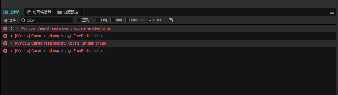用粒子拾取模型的形式发射Cannot read property ‘getFreeParticle’ of nul一直重复这两个报错,去掉粒子发射模型层就能播放正常