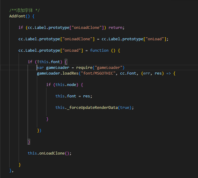 你那个引用gameLoader我不知道是怎么样的,我这边字体文件是放在resources文件夹里面加载的,你的this.font打印一下,_forceUpdateRenderData是label里面自带的,你的版本是2.4.X吗