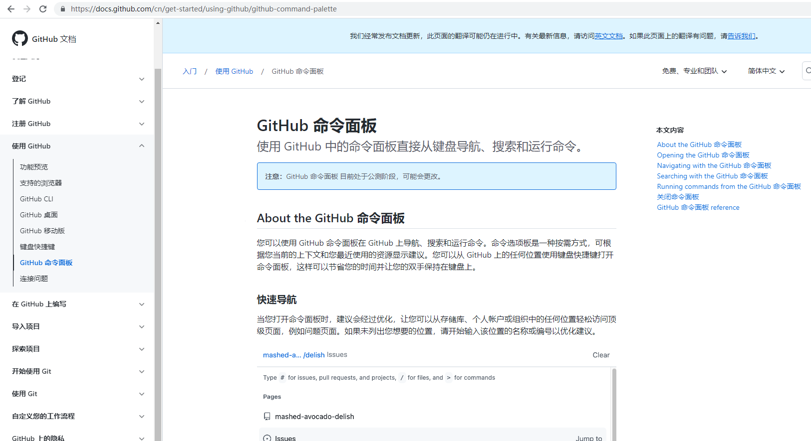 https://docs.github.com/cn/get-started/using-github/github-command-palette