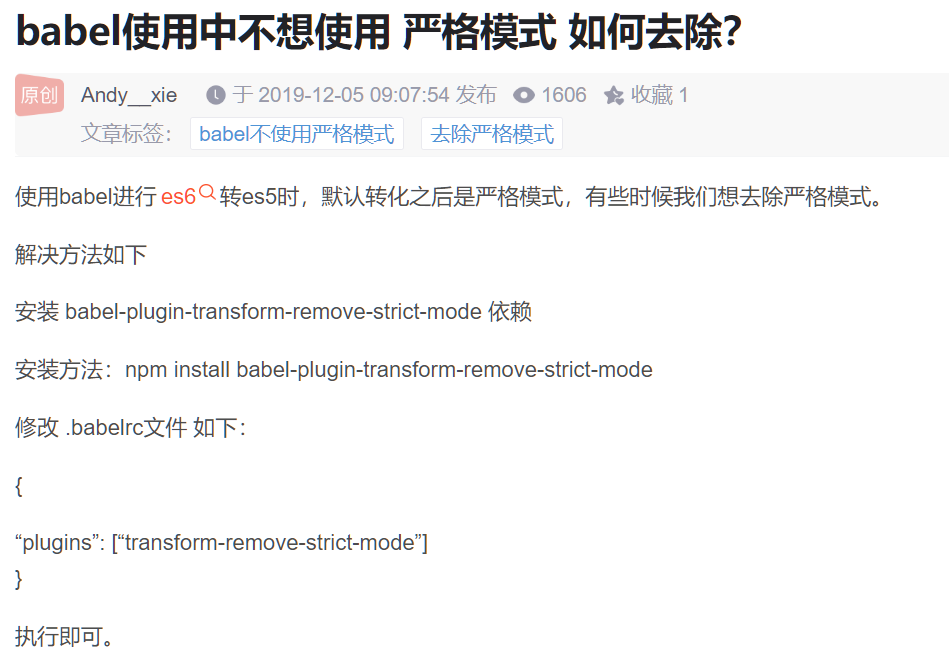 在项目中使用了import,预览运行一切顺利,但到真机就报错,因为有些只读变量被修改,因此猜测是因为import被转译自动加上了严格模式。百度一番发现可以npm安装babel-plugin-transform-remove-strict-mode来解决,但是这个到底该装在哪呢?求论坛大佬们指教