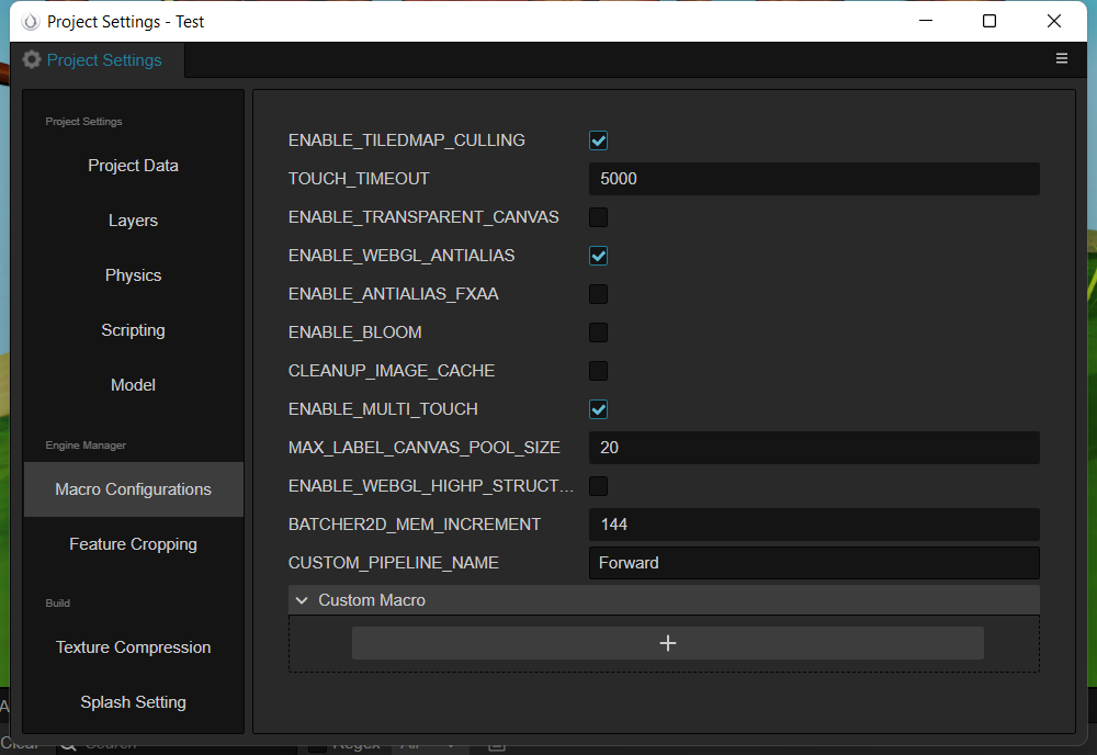 以及在Macro Configurations裏,設置CUSTOM_PIPELINE_NAME,支持Forward、Deferred兩種。