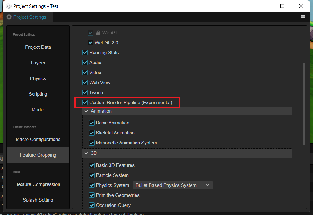 需要在Project Settings的Feature Cropping裏,開啓Custom Render Pipeline。
