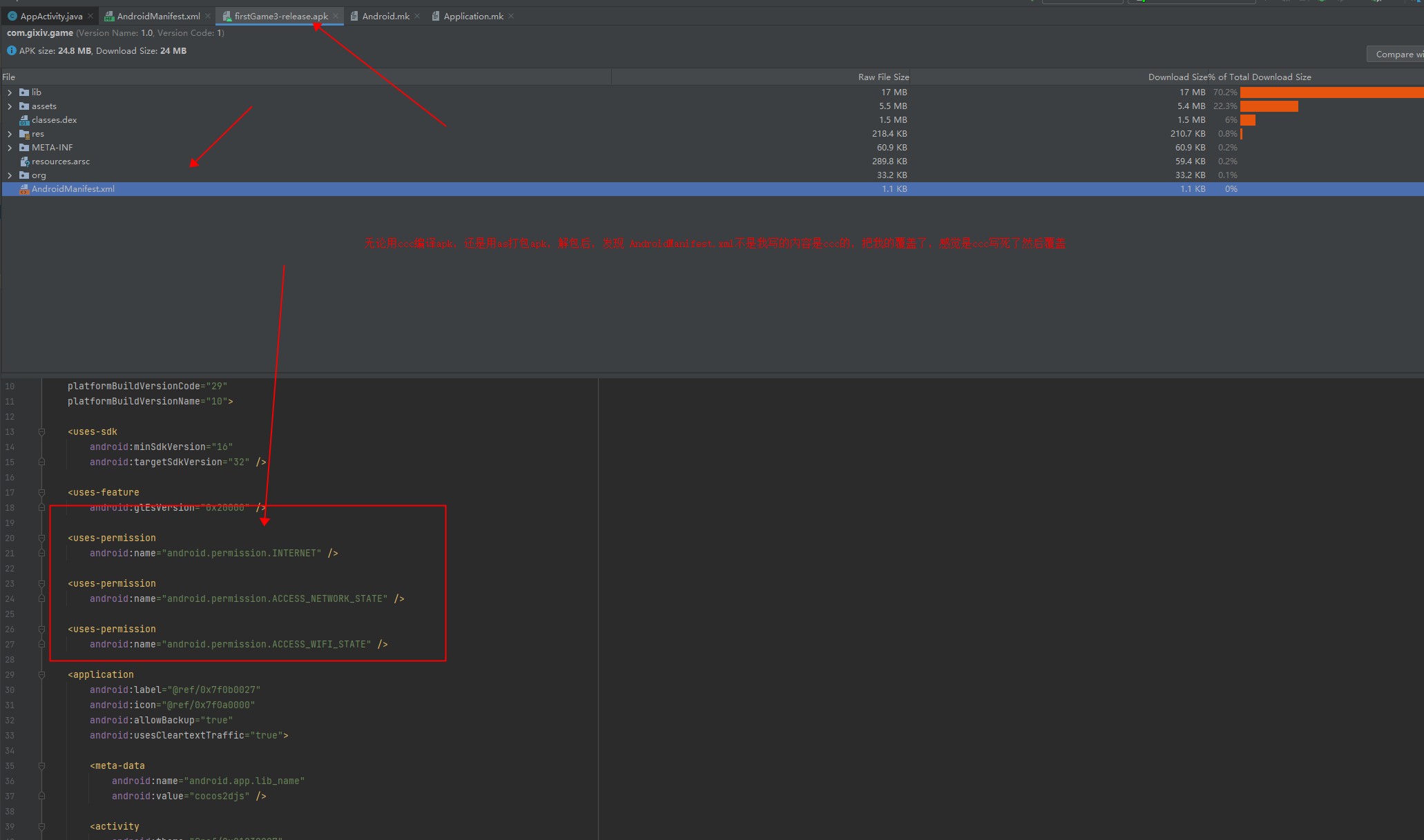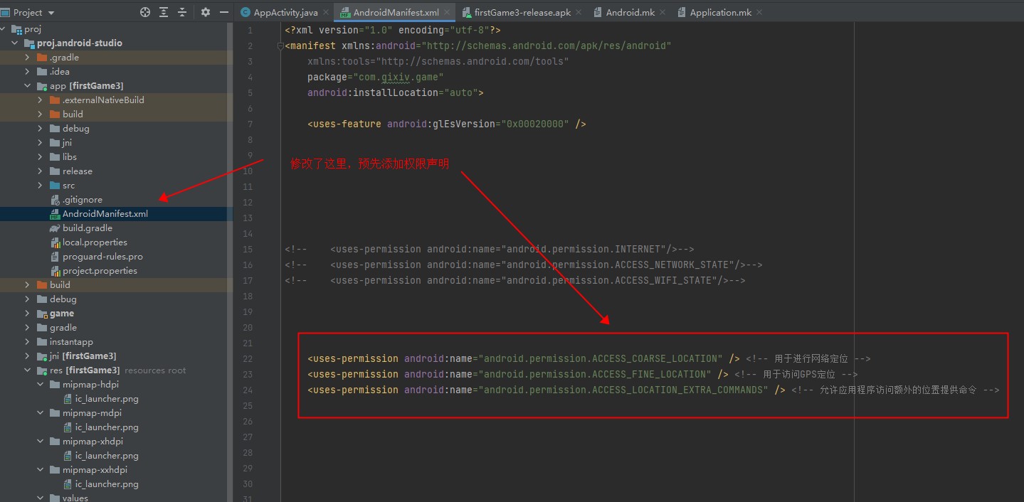 问下,我修改了proj.android-studio\app\AndroidManifest.xml 添加定位等权限,但是打包出apk时,AndroidManifest.xml中的内容又没有了