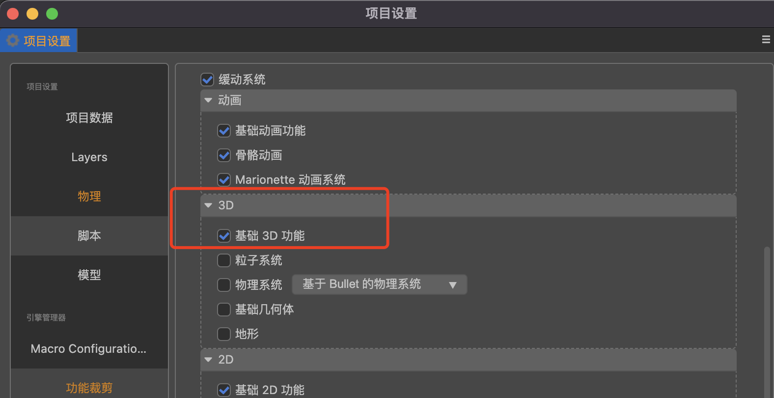 1、在编辑器的顶部菜单栏找到 项目 -> 项目设置 -> 功能裁剪 -> 3d(3d 基础功能) 勾选上。然后重启一下编辑器。(重启方式,可以关闭编辑器重启 获取选择 ctrl/ command + R 重启)