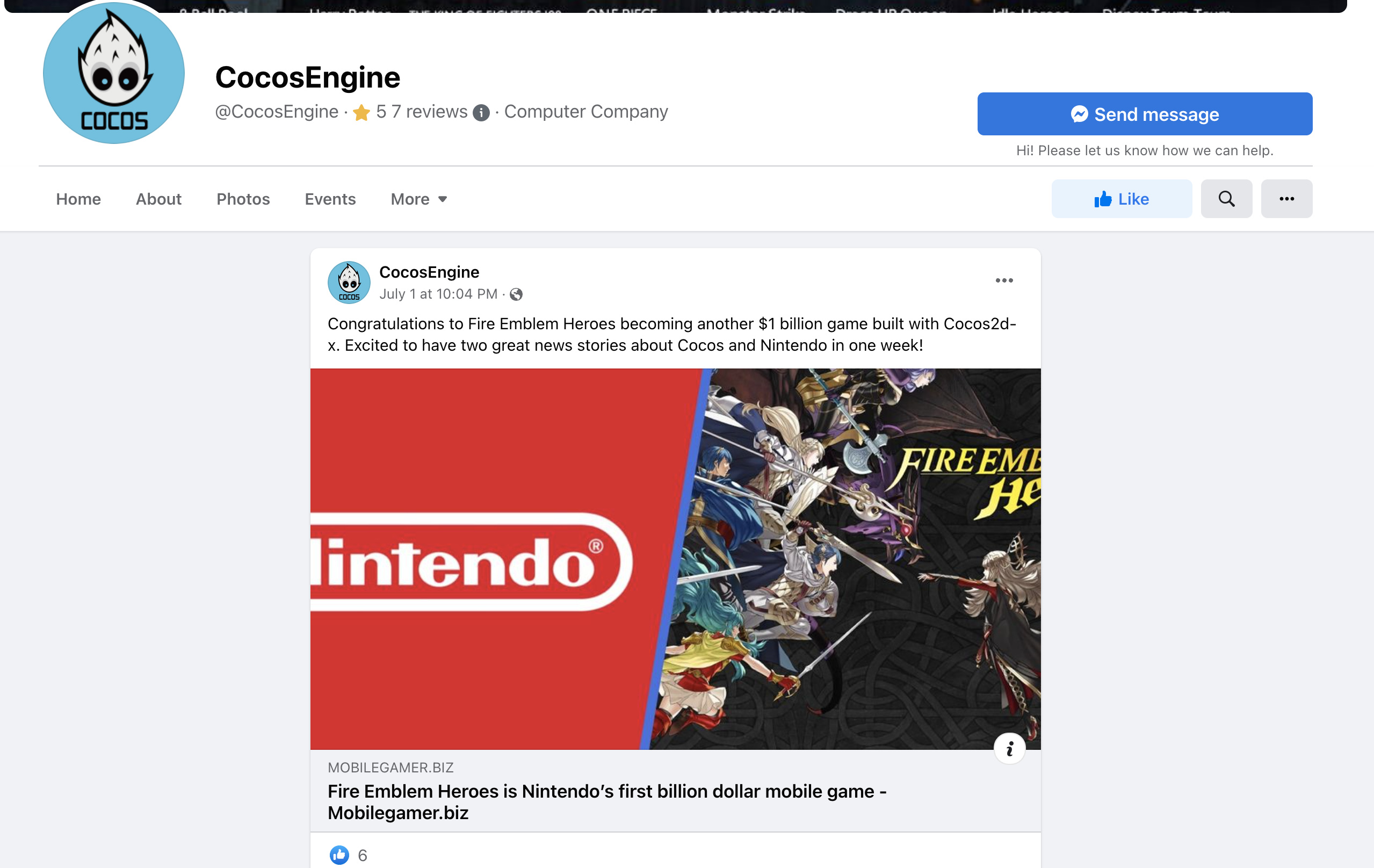 Cocos 与任天堂的缘分早已开始。2016年,任天堂推出了基于 Cocos 引擎开发的首款社交类手游《Miitomo》;紧接着在2017年,同样使用 Cocos 引擎开发的国民 IP 改编手游《火焰纹章:英雄》发售,首日仅日本地区就为任天堂带来了超两千万人民币的营收。最新数据显示,《火焰纹章:英雄》目前全球内创收已达 10 亿美元,成为任天堂旗下最赚钱的手游。