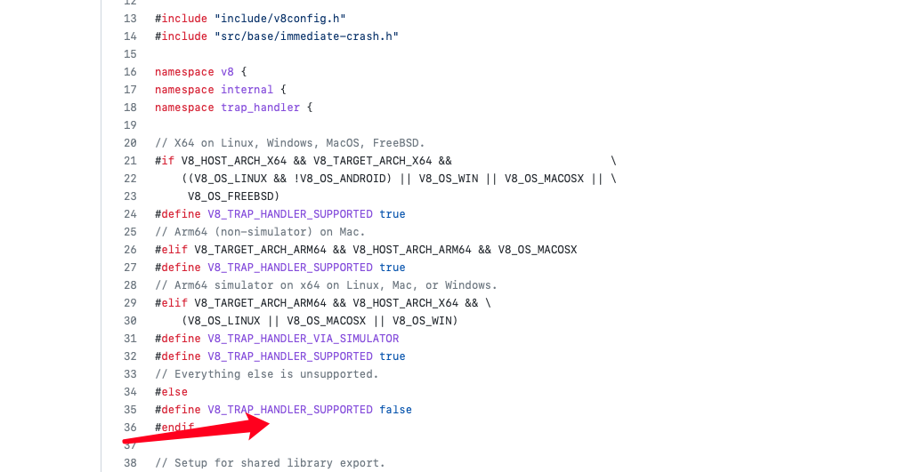 问题大概找到了 V8_TRAP_HANDLER_SUPPORTED 应该是false 不知道为什么编译走到了true