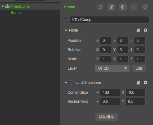 3、在scene上创建一个节点VTest2,并把VTestComp控件拖到VTest2上,然后在VTestComp上再添加一个Sprite,最后把节点拖到资源管理器上。从资源管理上直接打开VTest2这个Prefab文件,删除Sprite-001,然后又把Sprite添加回去