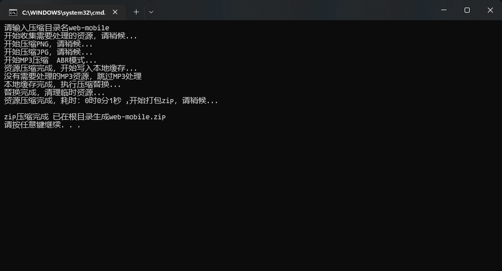 批量压缩资源里面的东西放在web-mobile同级目录。就是build目录下,不要放在批量压缩资源这个文件夹里面