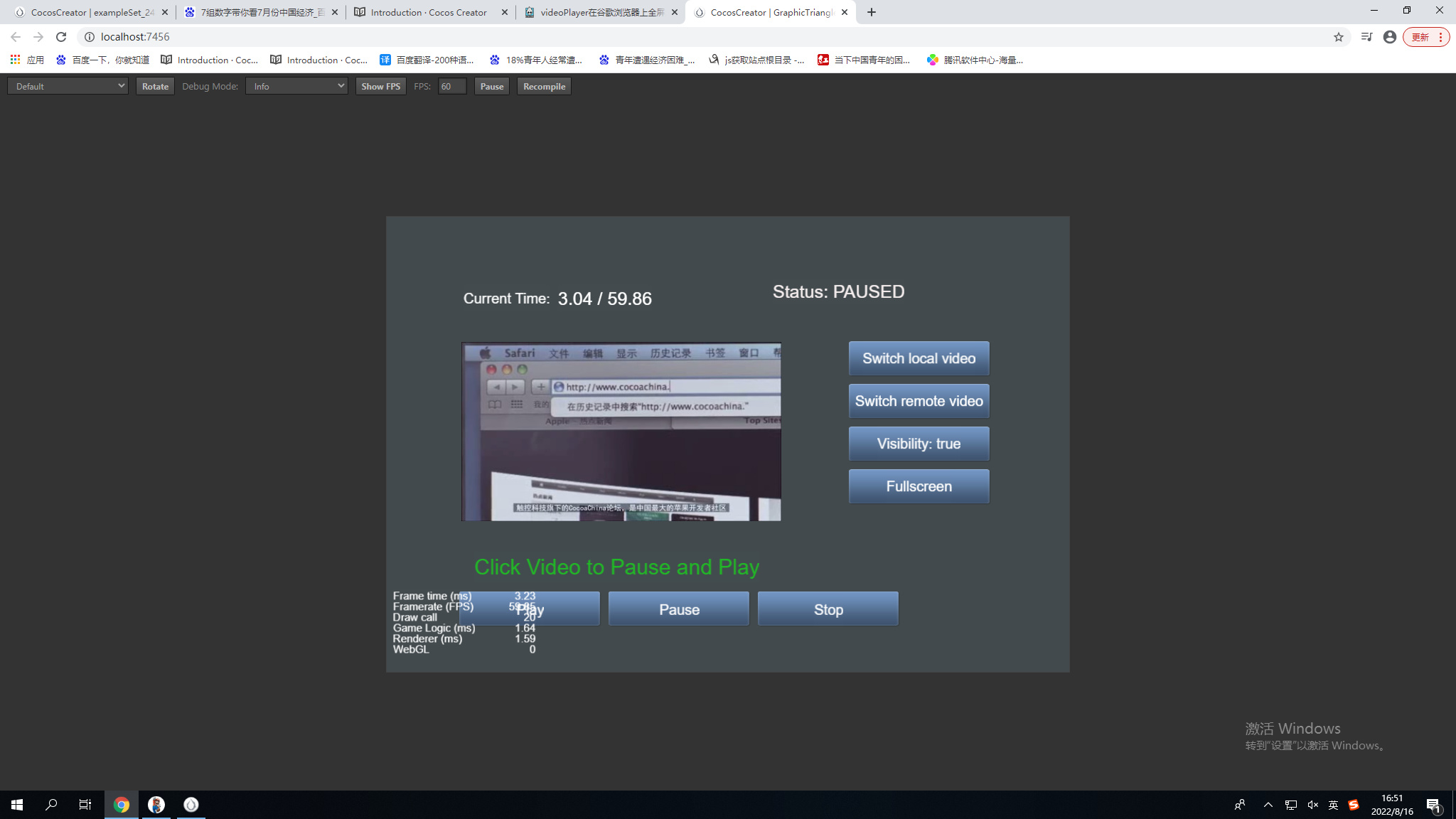 ____使用cocosDashborad创建范例项目,切换到videoPlayer组件场景,点击paly开始播放测试视频,点击右侧全屏按钮(要点击按钮右侧,或者超出右侧),全屏之后,频繁点击画面(一般点击画面是期望暂停或者播放),视频只会卡一下就继续播放,超过一定次数(七八次或者更多次)之后,可能会完全卡住。可能会莫名退出全屏,退出全屏之后就正常了。