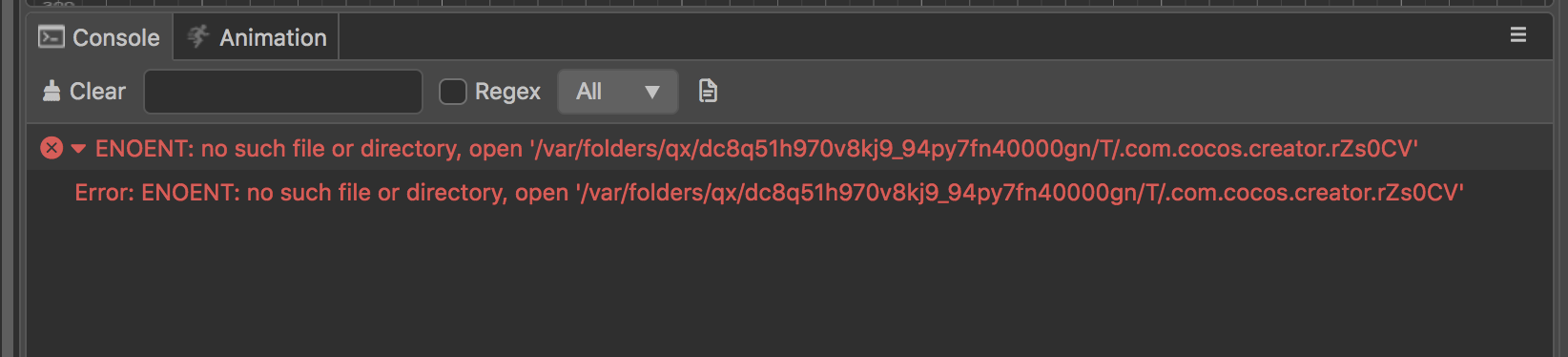 Error: ENOENT: no such file or directory, open ‘/var/folders/qx/dc8q51h970v8kj9_94py7fn40000gn/T/.com.cocos.creator.rZs0CV’