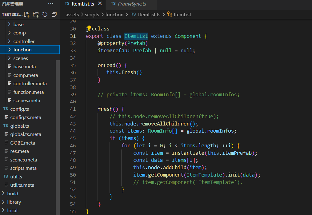 如图,我有一个节点包含一个脚本ItemList.ts,这个脚本中引用了一个global.ts脚本的类的实例