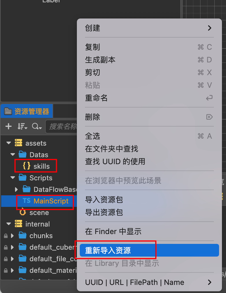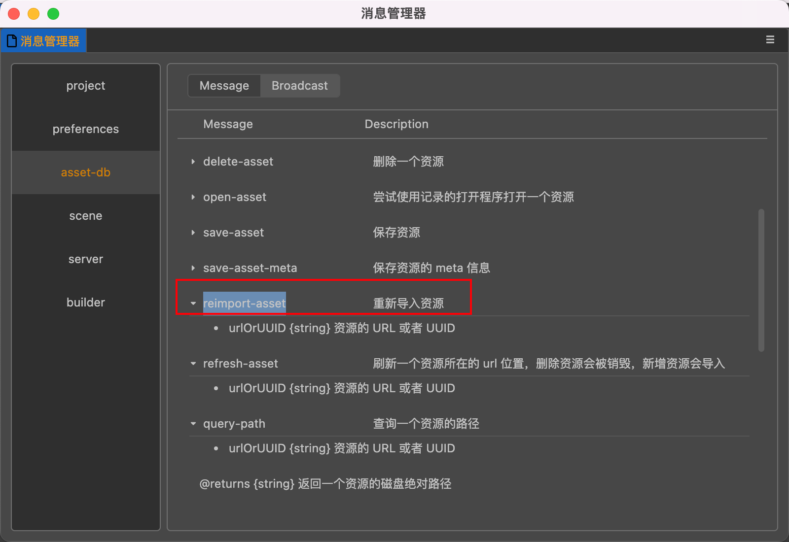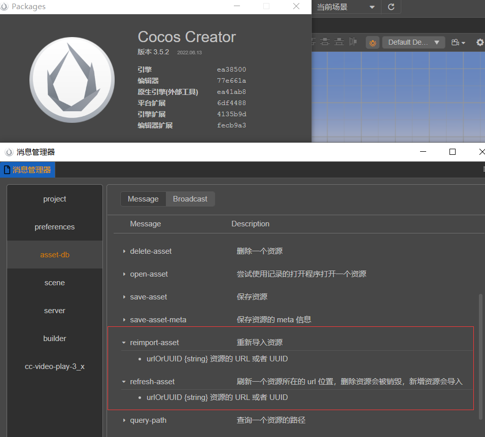 顶部菜单 -> 开发者 -> 消息列表 -> asset-db -> refresh-asset