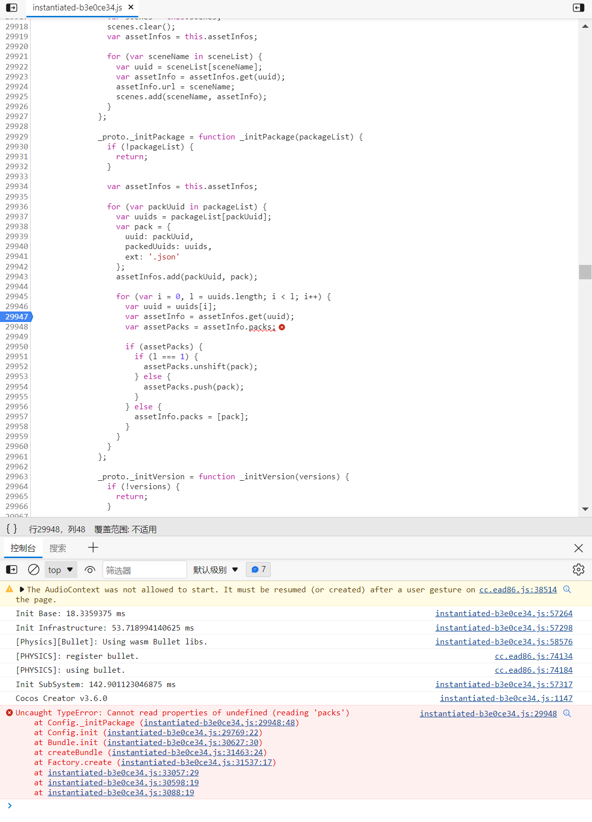 不论是 web-mobile还是web-desktop 发布后运行都卡在这里,而且似乎像死循环似的整个浏览器都在卡: