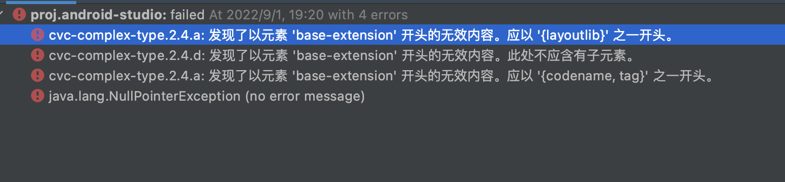 cvc-complex-type.2.4.a: 发现了以元素 ‘base-extension’ 开头的无效内容。应以 ‘{layoutlib}’ 之一开头。