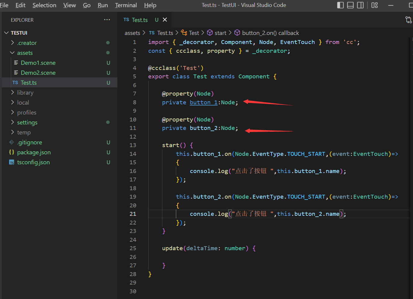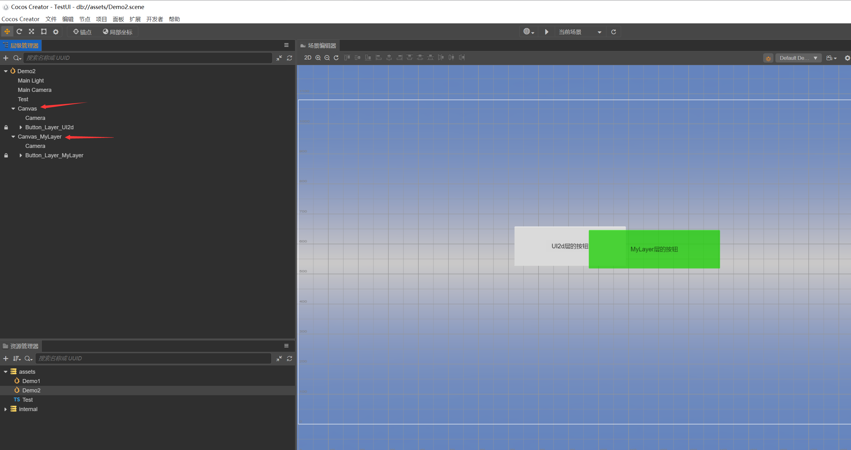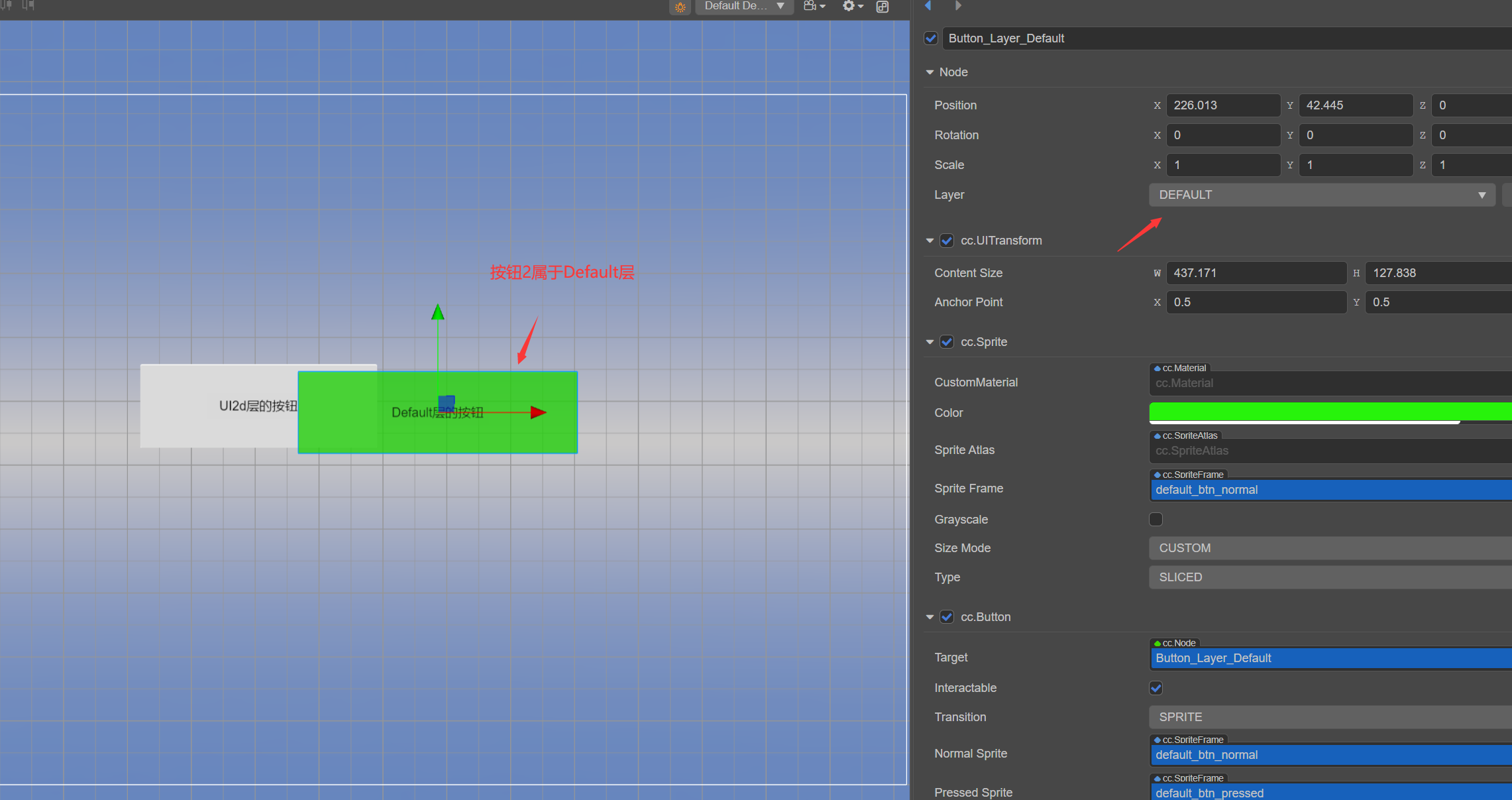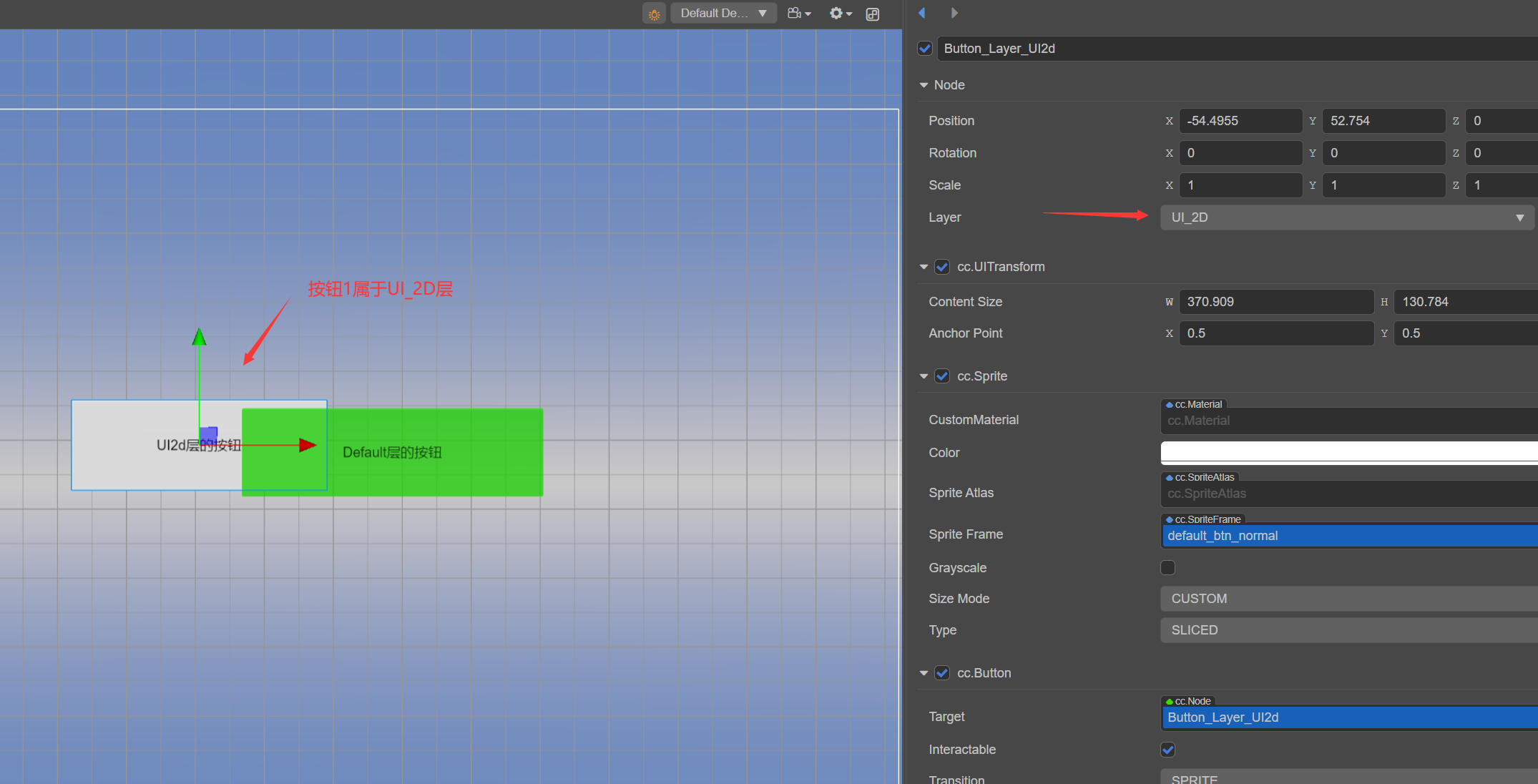 继续测试点击事件,结果还是一样,底下的白色按钮因为属于UI_2d层,就算其他层的UI盖在上面,事件一定是UI_2d层的节点截获。