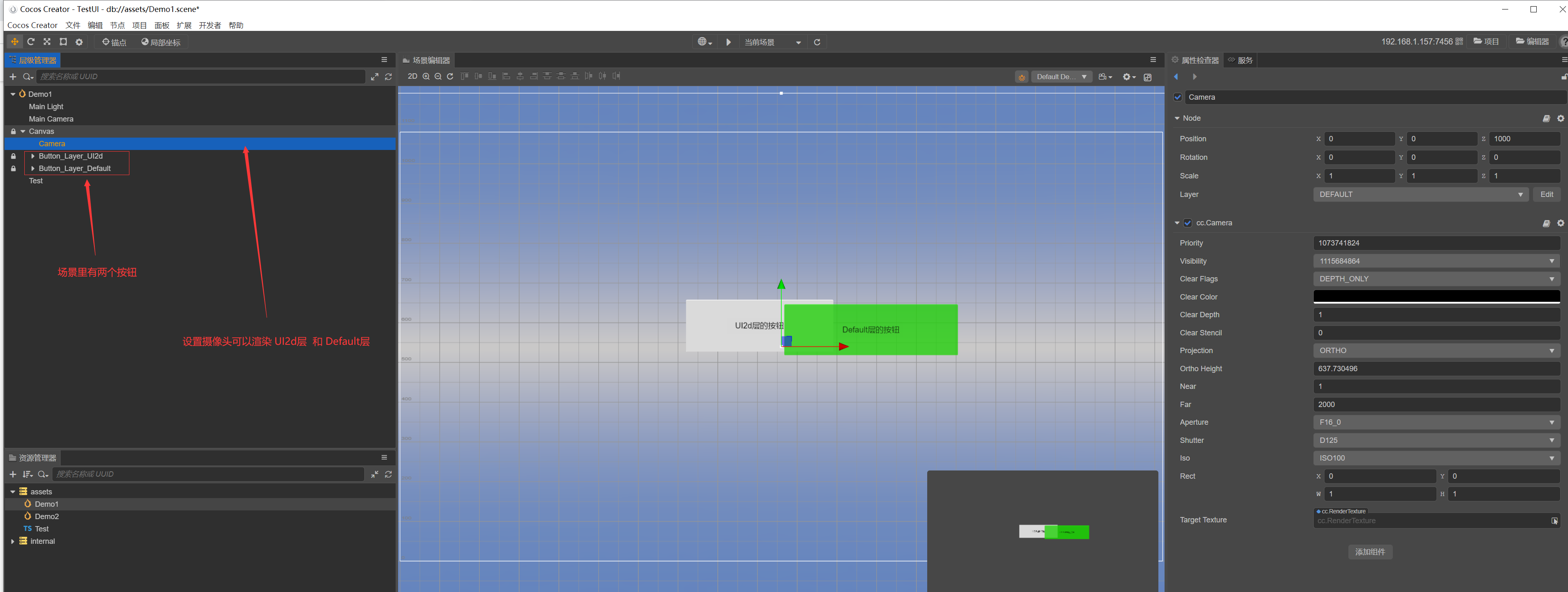另外做了个试验,创建了两个Canvas组件,把两个按钮设置不同的层,放在不同的Canvas下,用独立的摄像机渲染。截图里MyLayer是自定义的层