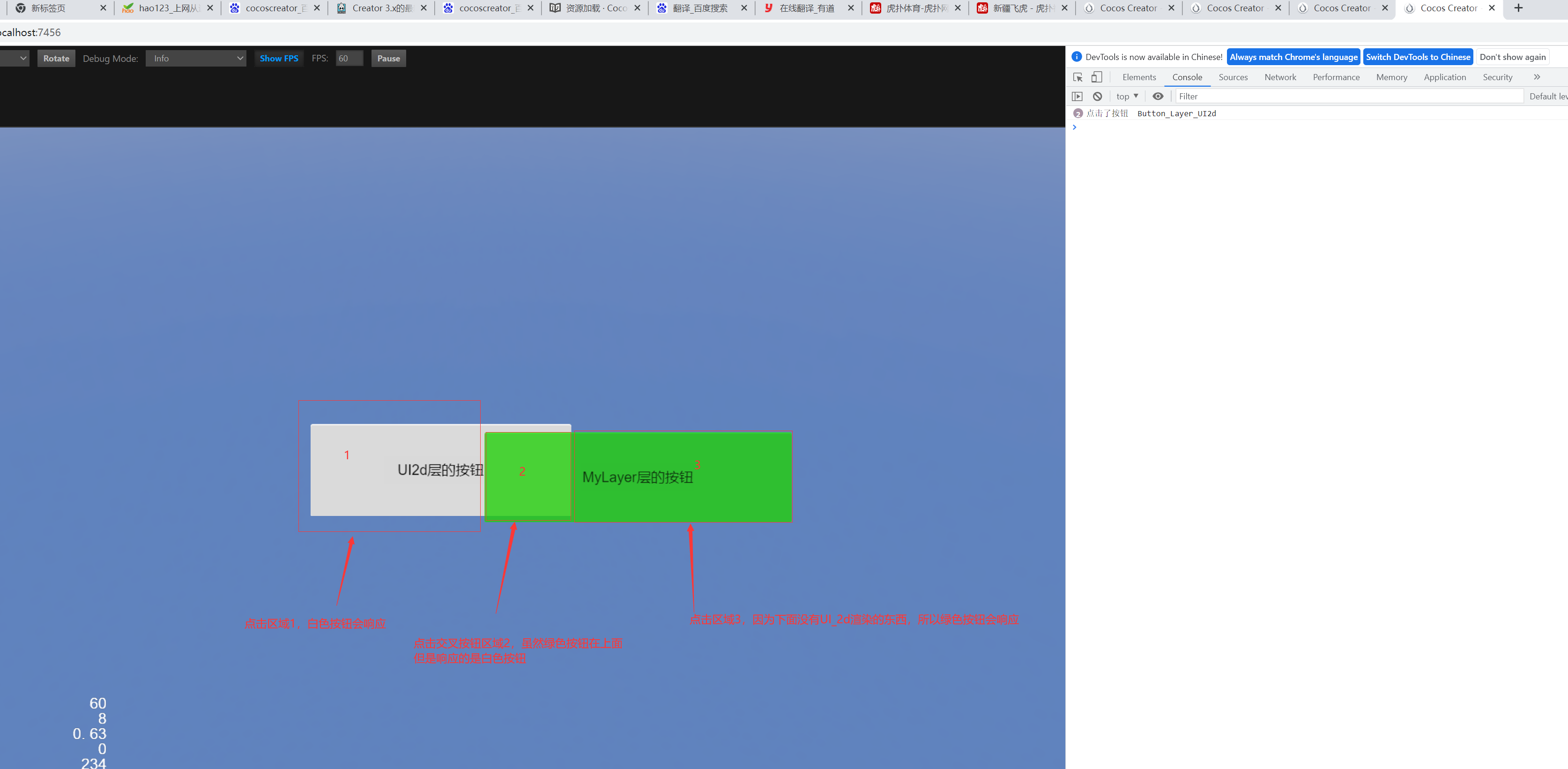 其中区域2是两个按钮的交叉部分,但是绿色按钮在上面,理论上点击这个区域绿色按钮会响应,但是响应的是底下的白色按钮。这是bug。creator2.x不会有这种情况