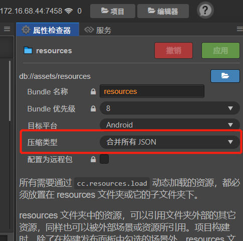 在打开构建面板的情况下,调整resources的压缩类型为合并所有json,再次构建无法合并json,只能重新打开构建面板后,json才合并