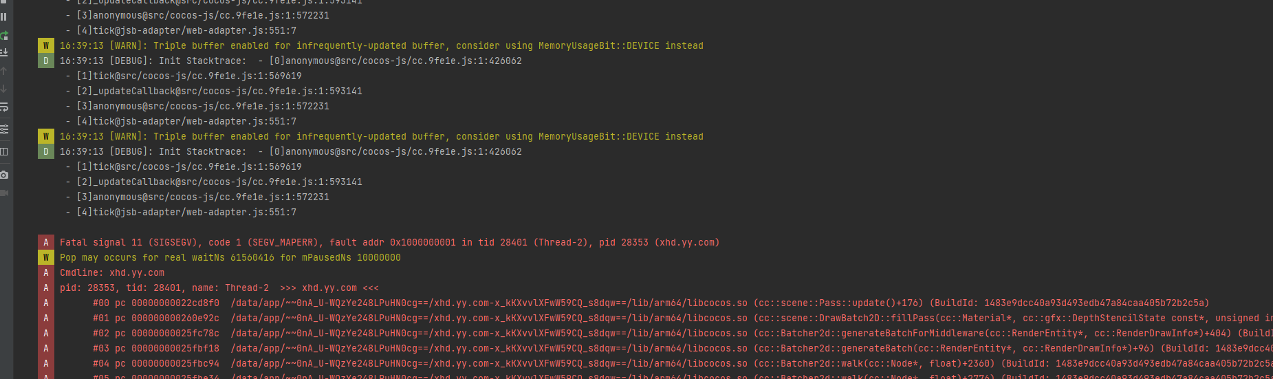 2025-06-30 16:39:14.142 29039-29039 DEBUG crash_dump64 A #20 pc 00000000025fb1e0 /data/app/~~0nA_U-WQzYe248LPuHN0cg==/xhd.yy.com-x_kKXvvlXFwW59CQ_s8dqw==/lib/arm64/libcocos.so (cc::Batcher2d::fillBuffersAndMergeBatches()+136) (BuildId: 1483e9dcc40a93d493edb47a84caa405b72b2c5a)