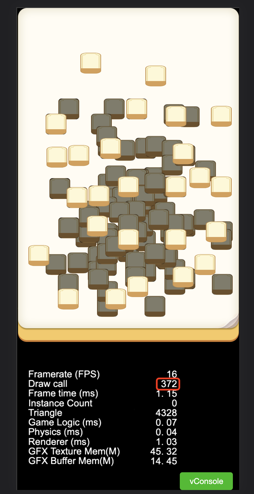 随机摆放了200多个同一预制体,预制体里面只有卡牌和一个阴影遮罩,弄一些预制体打开阴影遮罩,运行后发现DC高达372
