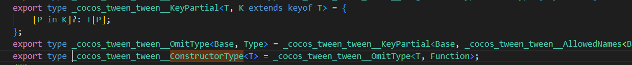 .d.ts 是 TypeScript 的类型定义文件,只是声明函数或变量的类型,不包含具体的实现,通常用于开发中的代码提示功能。但其实如果你继续在文件中查找 _cocos_tween_tween_ConstructorType,应该还是能看到这个 type 或 interface 的具体的内容。不过 Tween 的这个 ConstructorType 比较特殊,它是个包含 泛型 的类型定义。关于泛型你可以自己去百度下