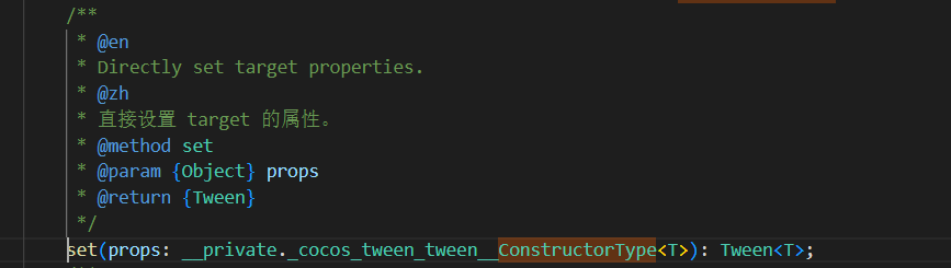 set 的用法可以参考下 缓动示例 中的用法,像文档中,tween 绑定的对象是个 Node,ConstructorType 指的就是 Node 类的属性,比如 position、scale 等。