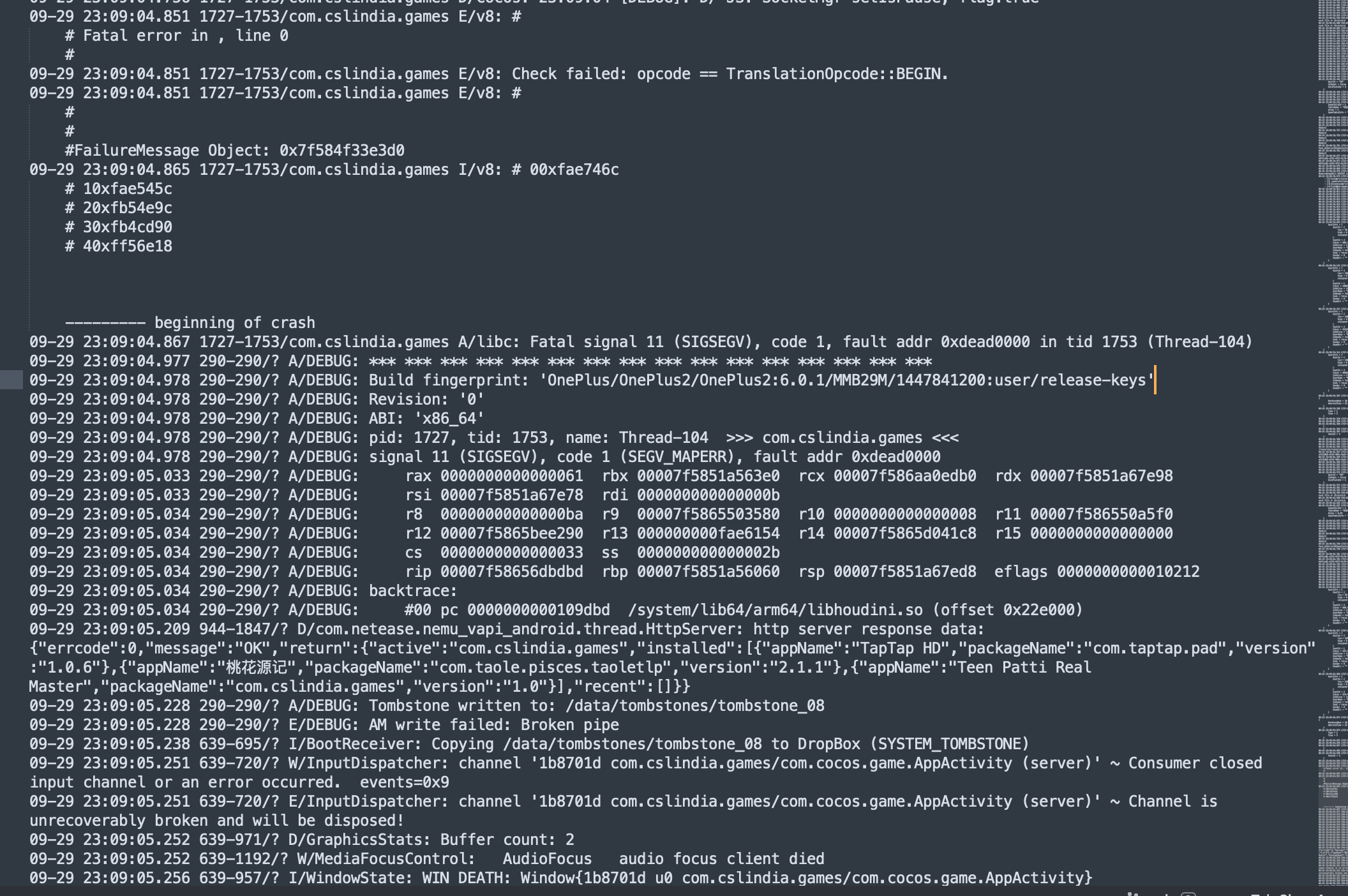 09-29 23:09:04.867 1727-1753/com.cslindia.games A/libc: Fatal signal 11 (SIGSEGV), code 1, fault addr 0xdead0000 in tid 1753 (Thread-104)