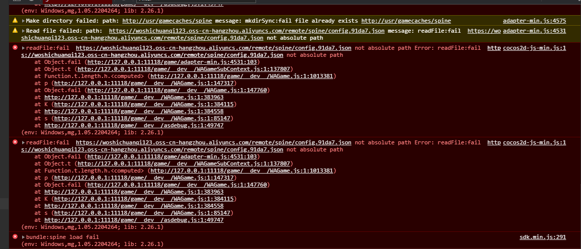 https://woshichuanqi123.oss-cn-hangzhou.aliyuncs.com/remote/spine/config.91da7.json 浏览器访问可以获取到数据,这个是哪里出问题呢